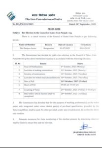 ਪੰਜਾਬ ਦੀ ਰਾਜਸਭਾ ਸੀਟ ਲਈ ਜ਼ਿਮਨੀ ਚੋਣ ਲਈ ਤਰੀਕ ਦਾ ਹੋਇਆ ਐਲਾਨ, ਇਸ ਦਿਨ ਪੈਣਗੀਆਂ ਵੋਟਾਂ