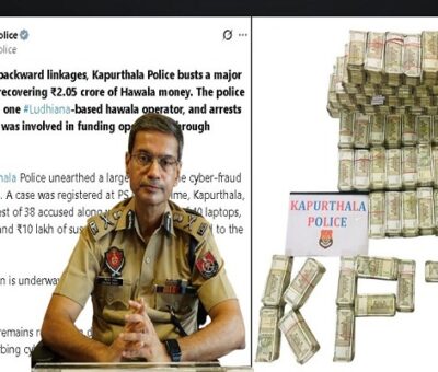 Read Moreਕਪੂਰਥਲਾ ਪੁਲਿਸ ਦੇ ਹੱਥ ਵੱਡੀ ਸਫਲਤਾ ਲੱਗੀ ਹੈ। ਕਪੂਰਥਲਾ ਸਾਈਬਰ ਕ੍ਰਾਈਮ ਪੁਲਿਸ ਤੇ ਲੁਧਿਆਣਾ ਕਮਿਸ਼ਨਰੇਟ ਪੁਲਿਸ ਵੱਲੋਂ ਸਾਂਝੇ ਆਪ੍ਰੇਸ਼ਨ ਤਹਿਤ ਵੱਡੇ ਹਵਾਲਾ ਨੈੱਟਵਰਕ ਦਾ ਪਰਦਾਫਾਸ਼ ਕ
